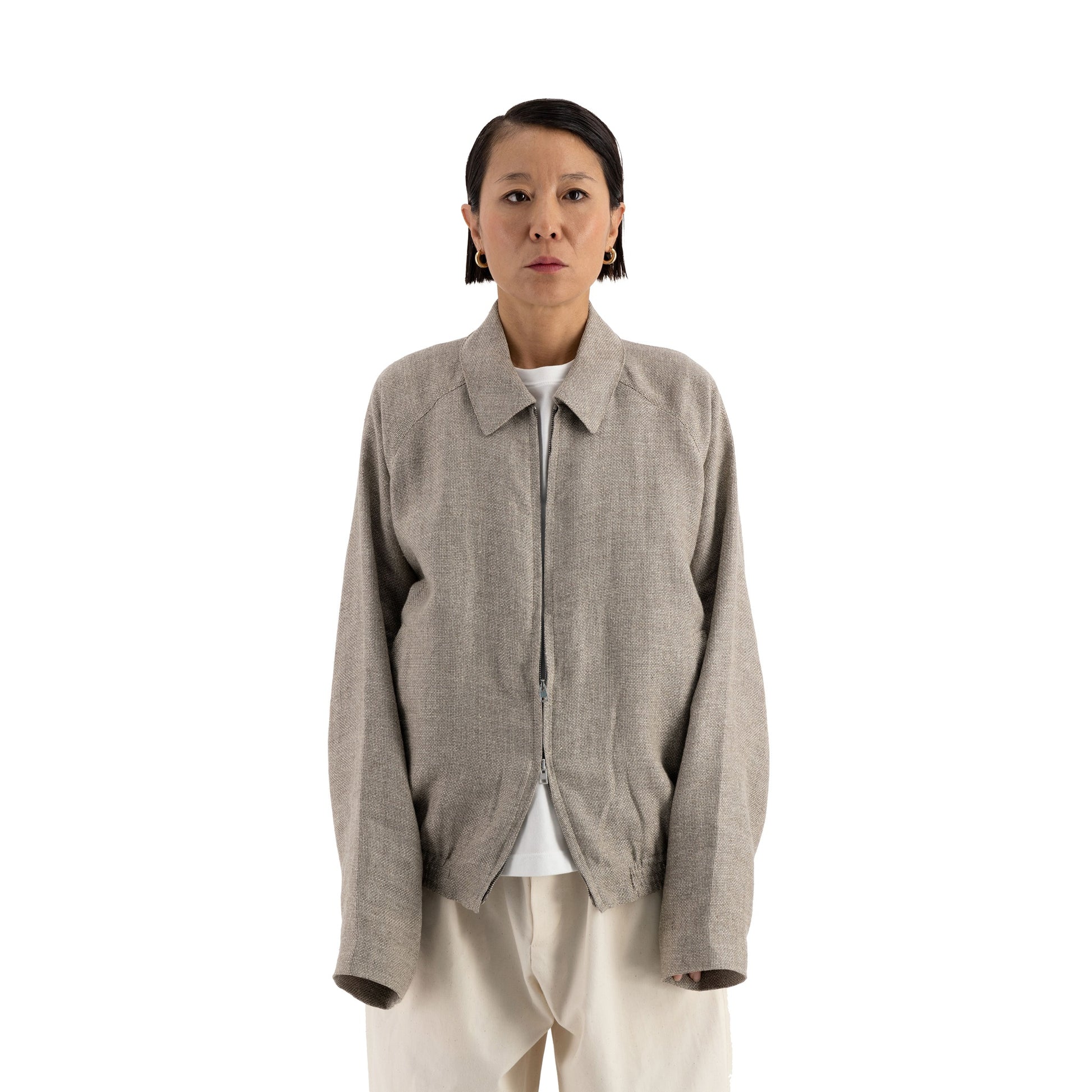 This unlined blouson is made of italian open weave hemp wool. It has a regular fit and features a saddle shoulder and a double zip closure. The hem ends at the waist and has an elasticated detail. A slit side pocket is featured on each side.