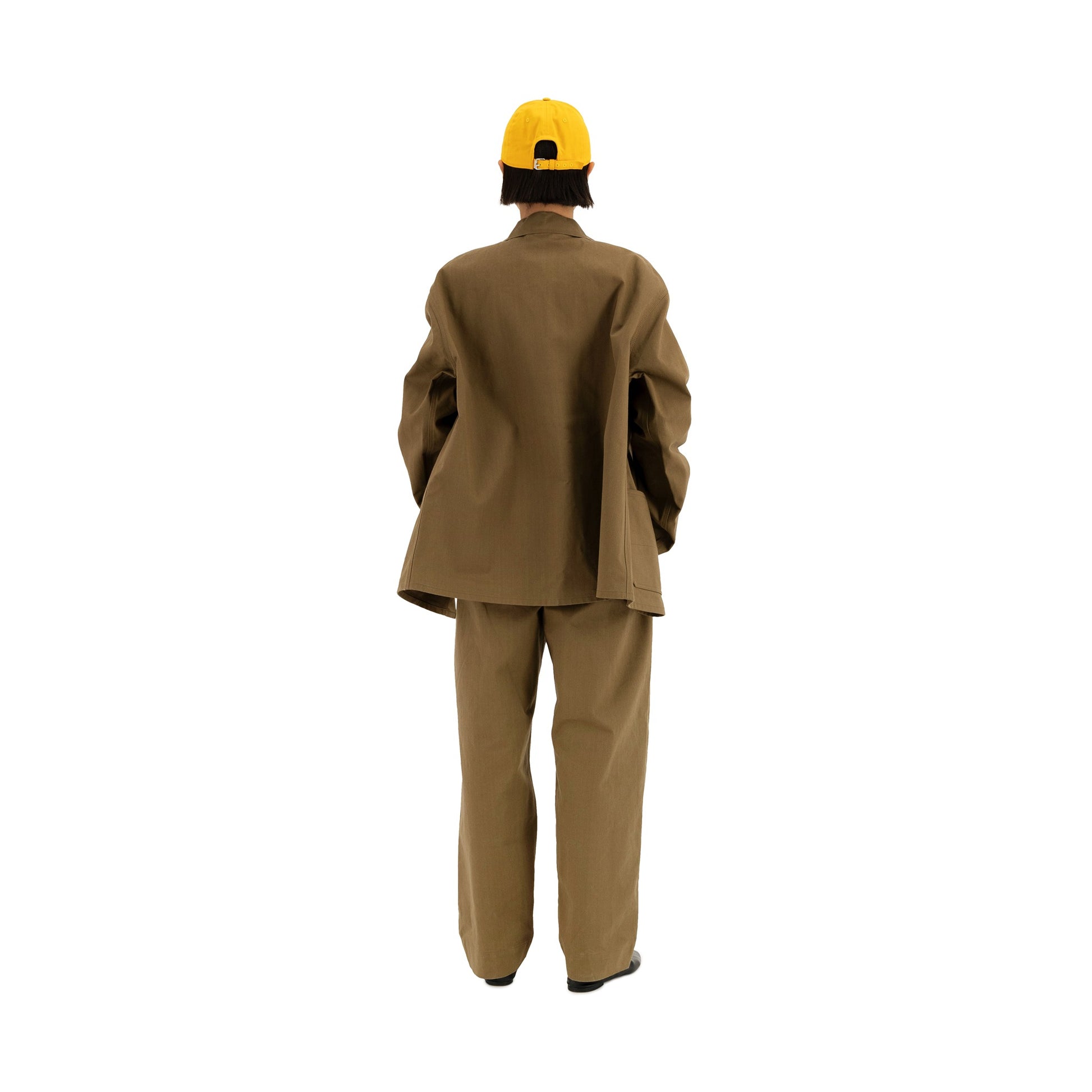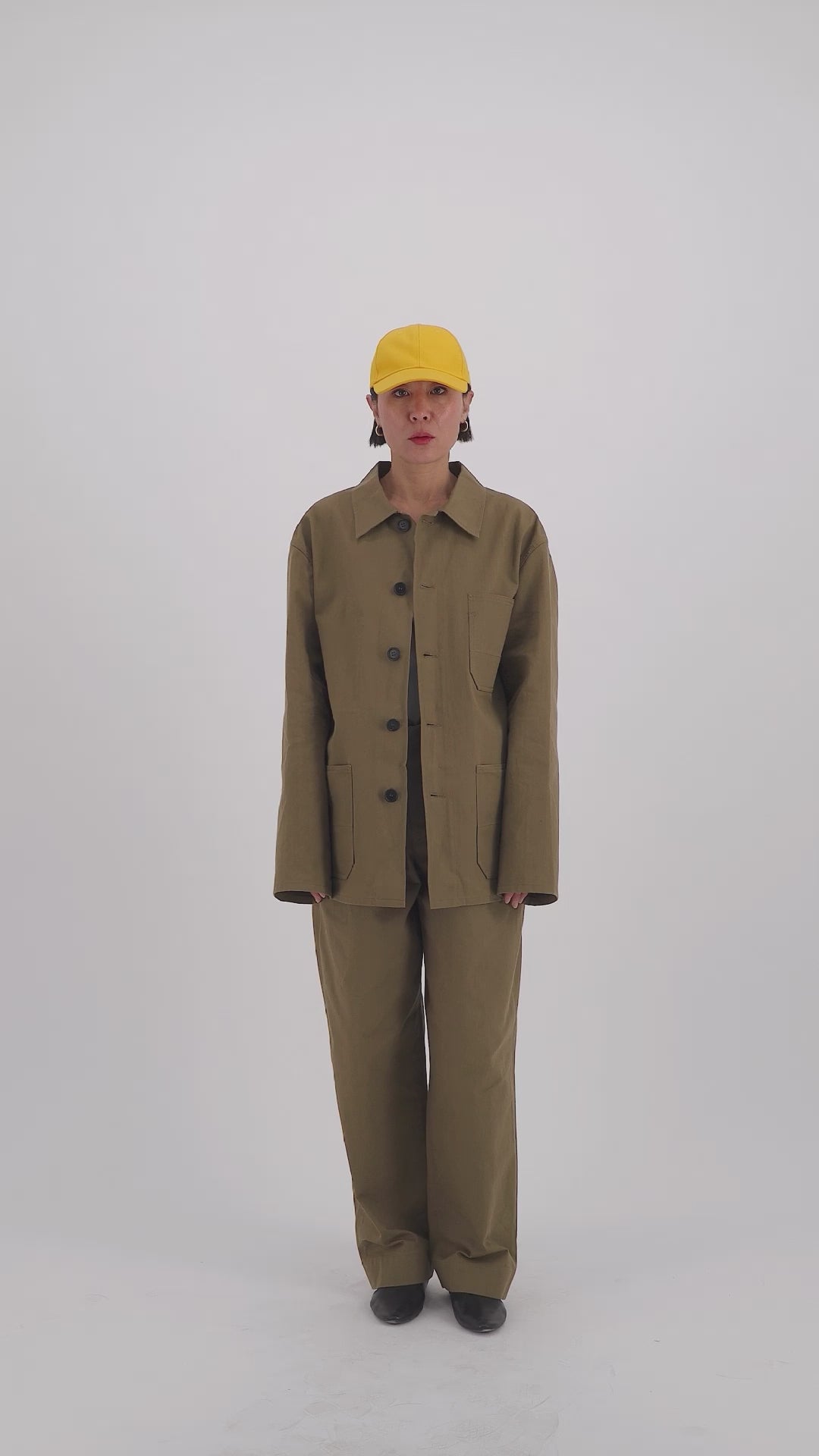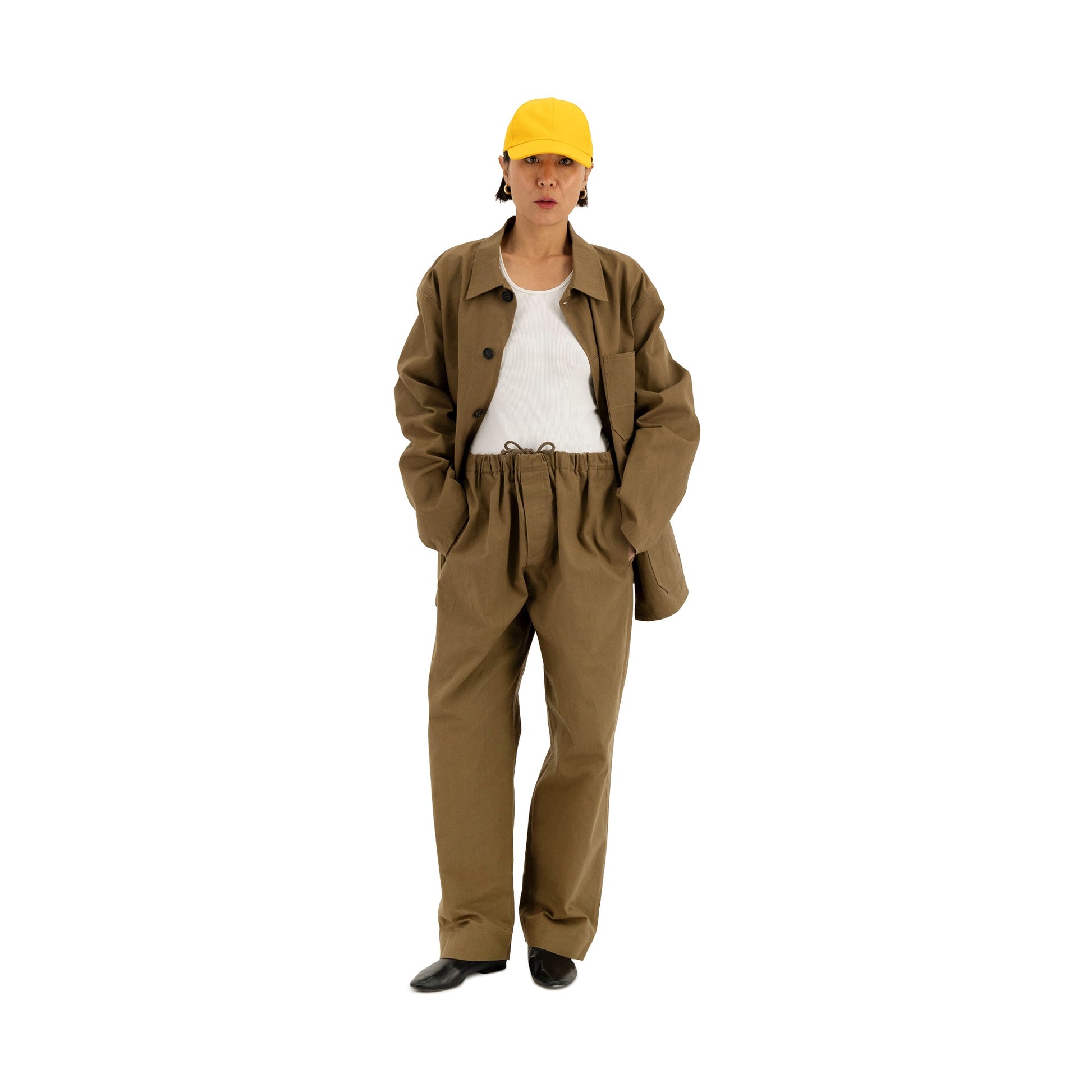 This unlined over- the - head anorak is made of japanese heavy cotton twill. It has an oversize fit with dropped shoulders and a shirting collar. It features a trompe l'oeil button line, without any buttons. Two hidden pockets on each side can be found at waist hight. The pocketbags show below the front waist as a design feature.