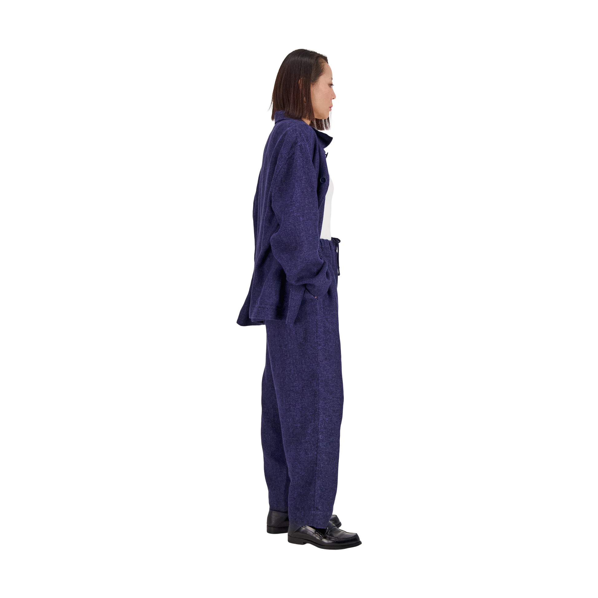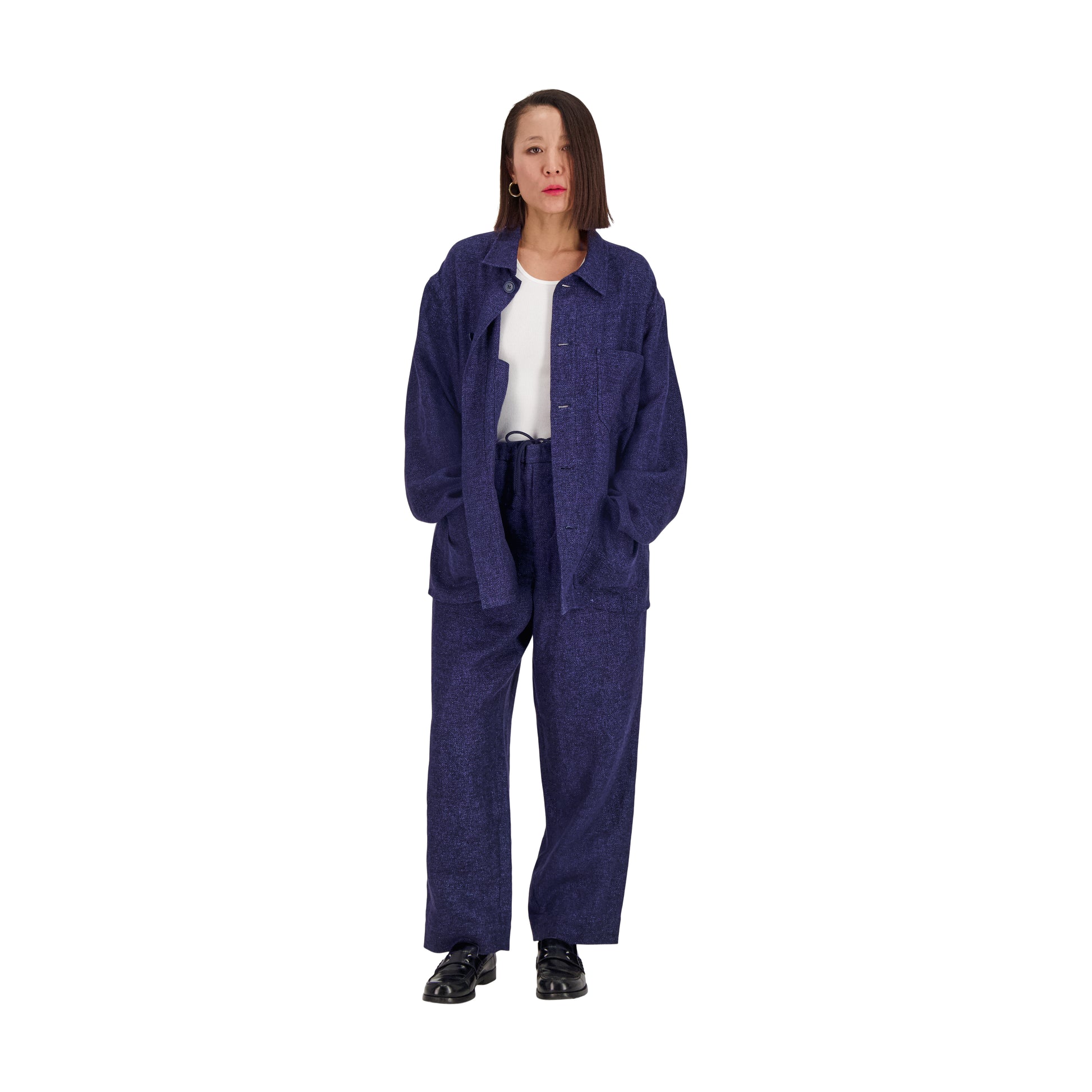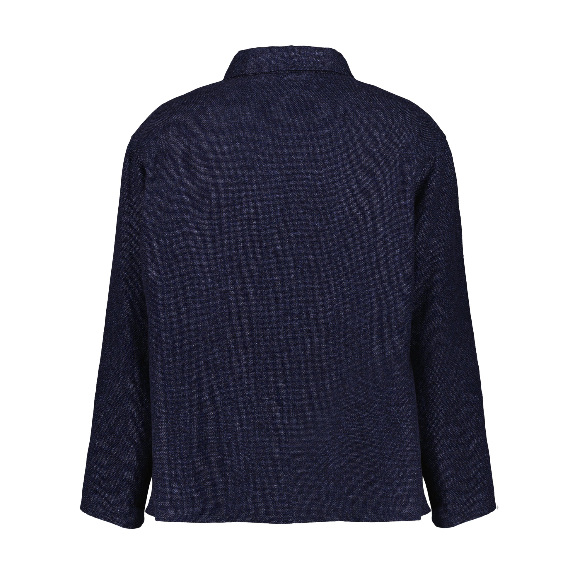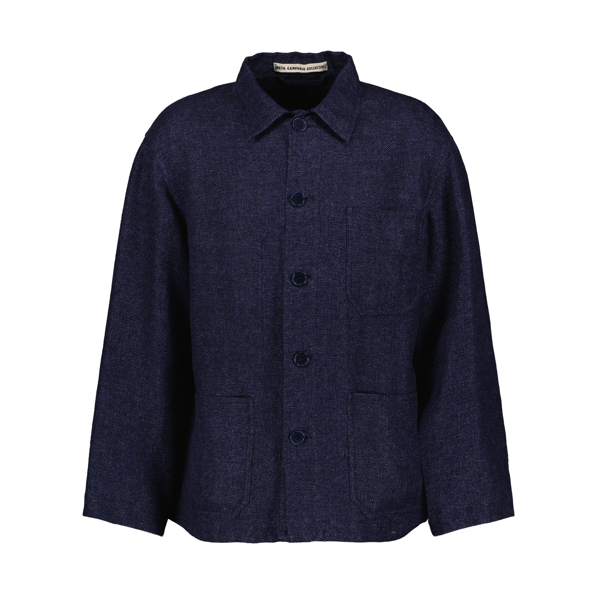 This unlined 5 button workwear jacket with a shirt collar is made of italian open weave hemp wool. It has a relaxed fit with dropped and unconstructed shoulders. It has one generous patch pocket on the left chest and two generous patch pockets on the waist. The sleeves don't feature a closure. The jacket is unlined with a securable inside patch pocket on the right side.