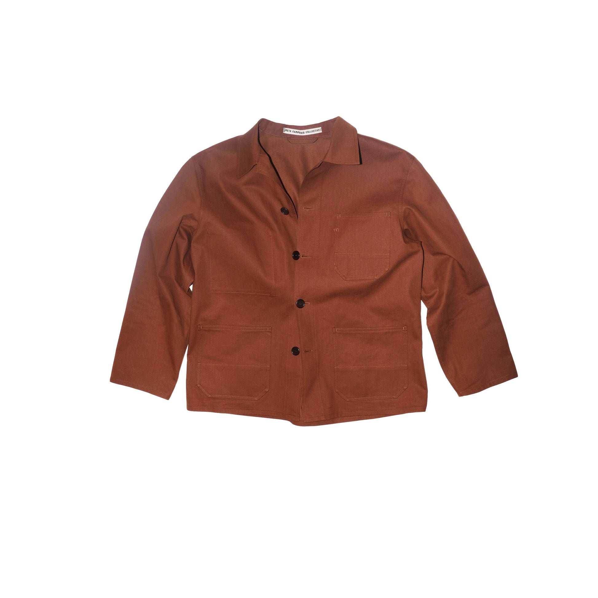 This unlined 5 button workwear jacket with a shirt collar is made of Japanese heavy cotton twill. It has a relaxed fit with dropped and unconstructed shoulders. It has one generous patch pocket on the left chest and two generous patch pockets on the waist. The sleeves don't feature a closure. The jacket is unlined with a securable inside patch pocket on the right side. A monogram is embroidered over the right stichting of the chest pocket.