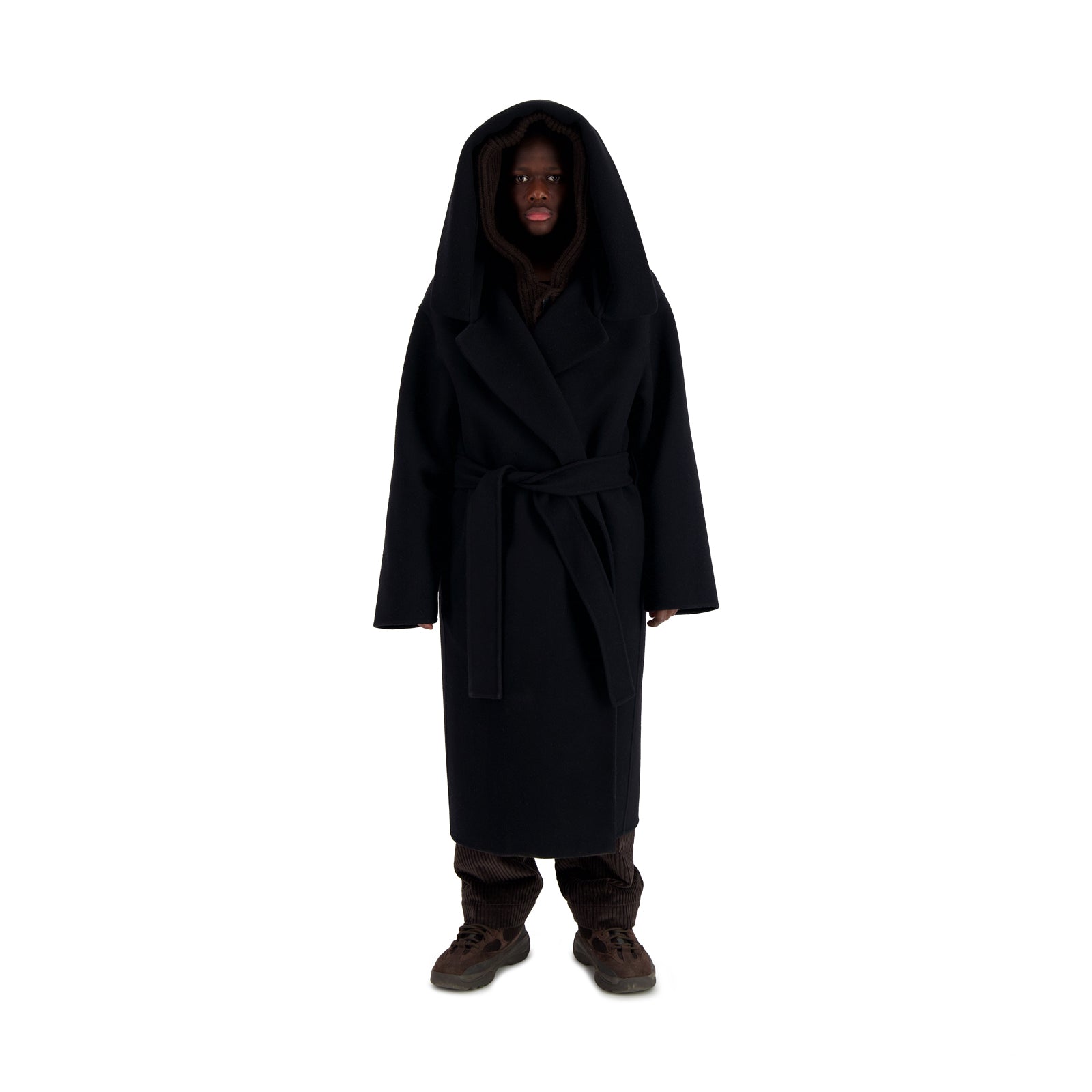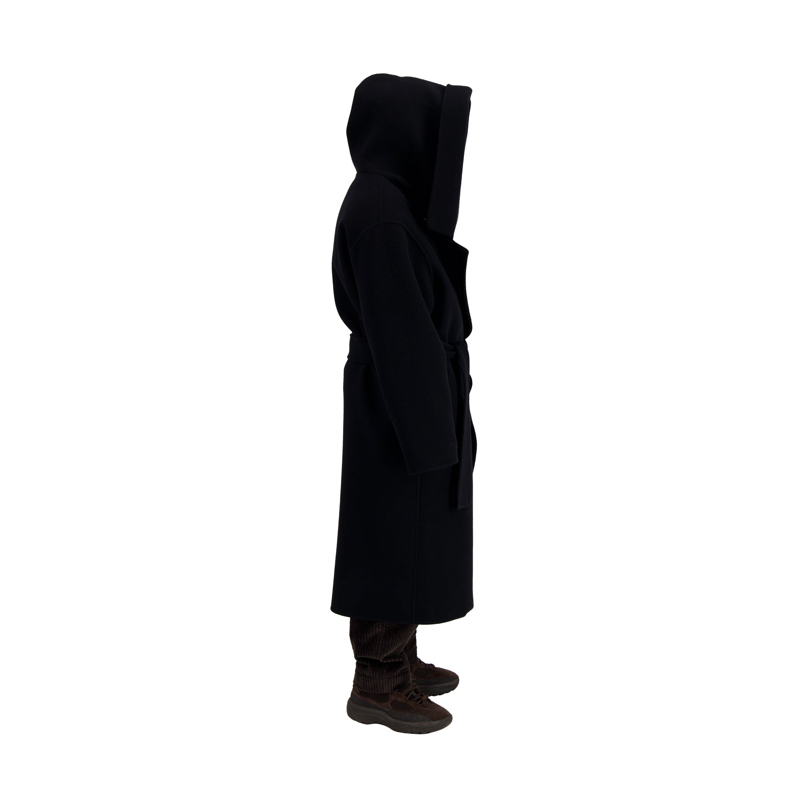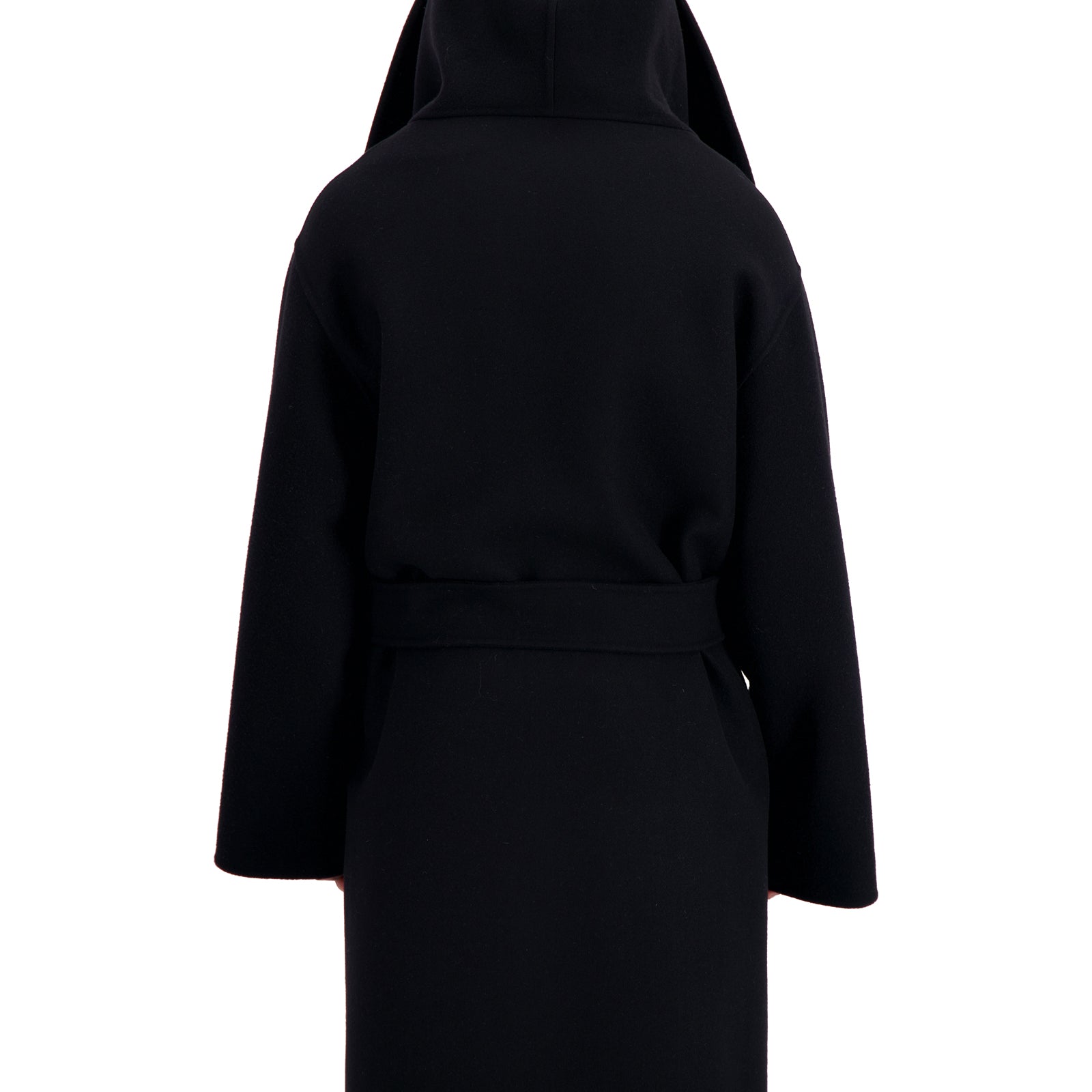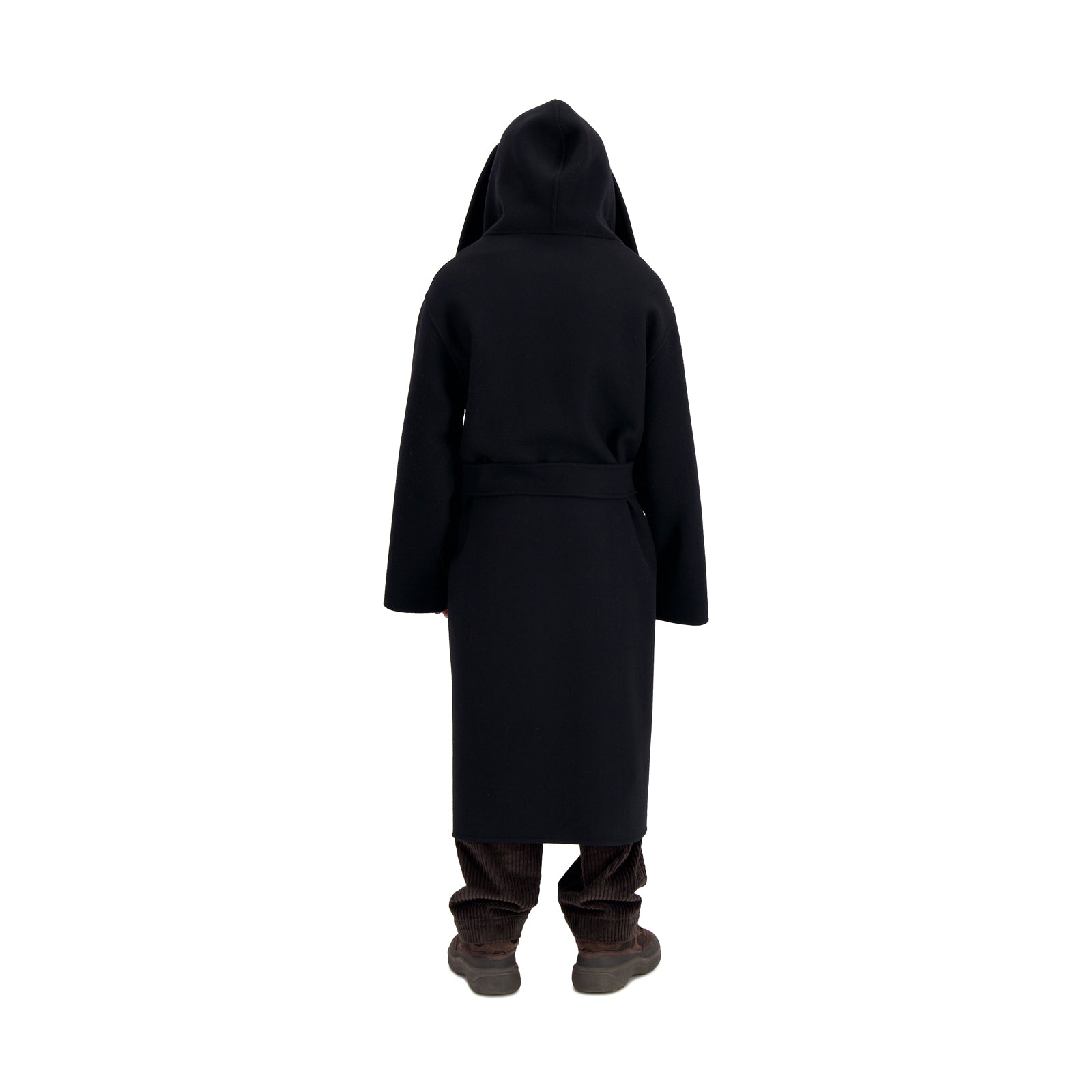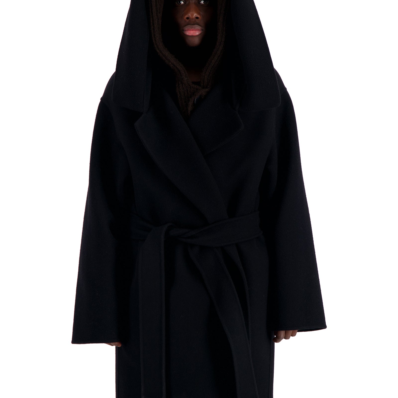 This wrap hooded coat is made of heavy Italian boiled wool soft to the hand.