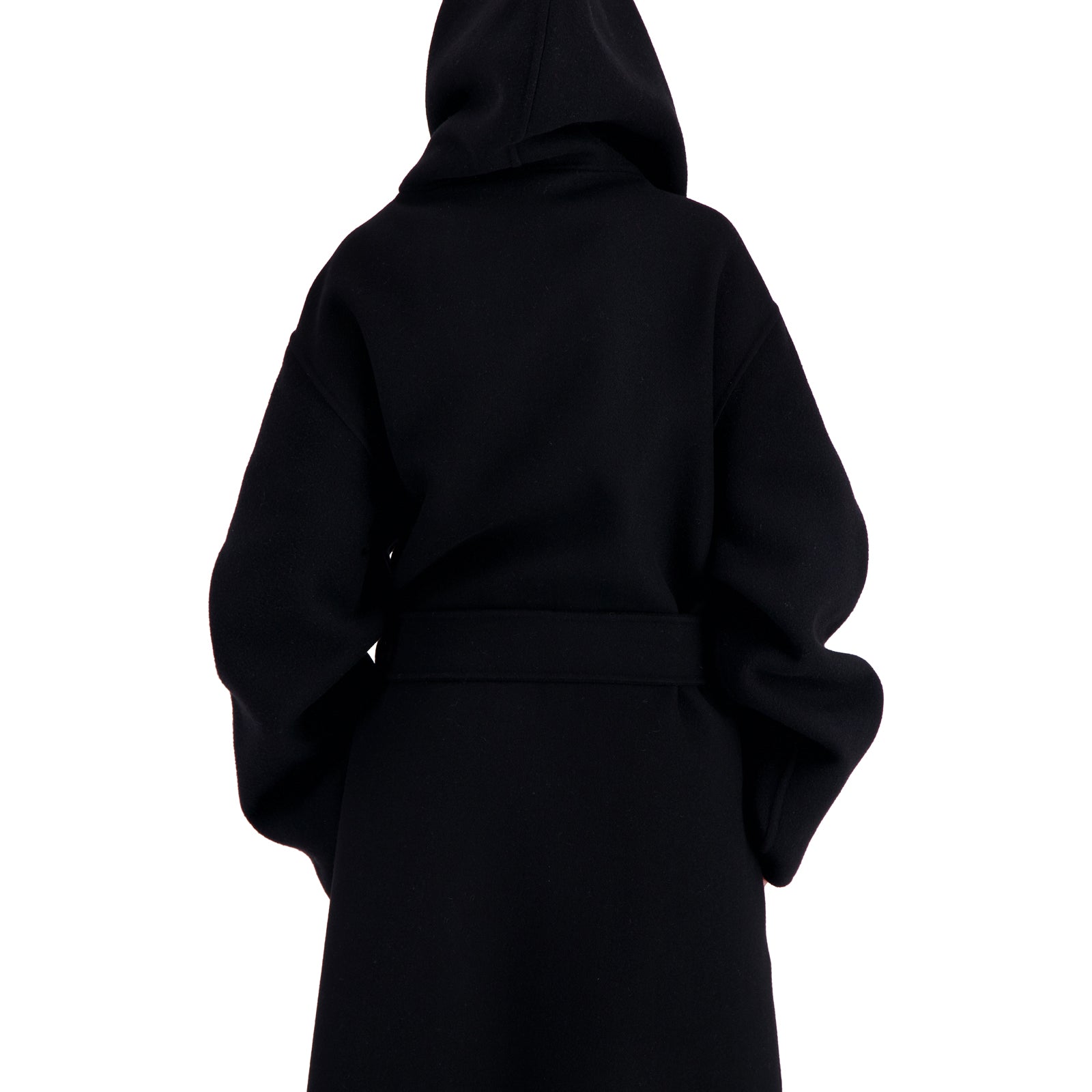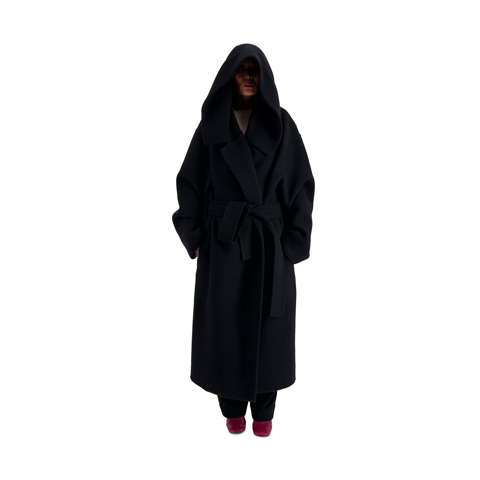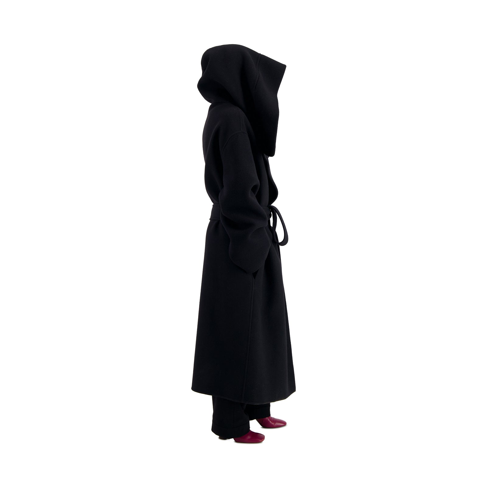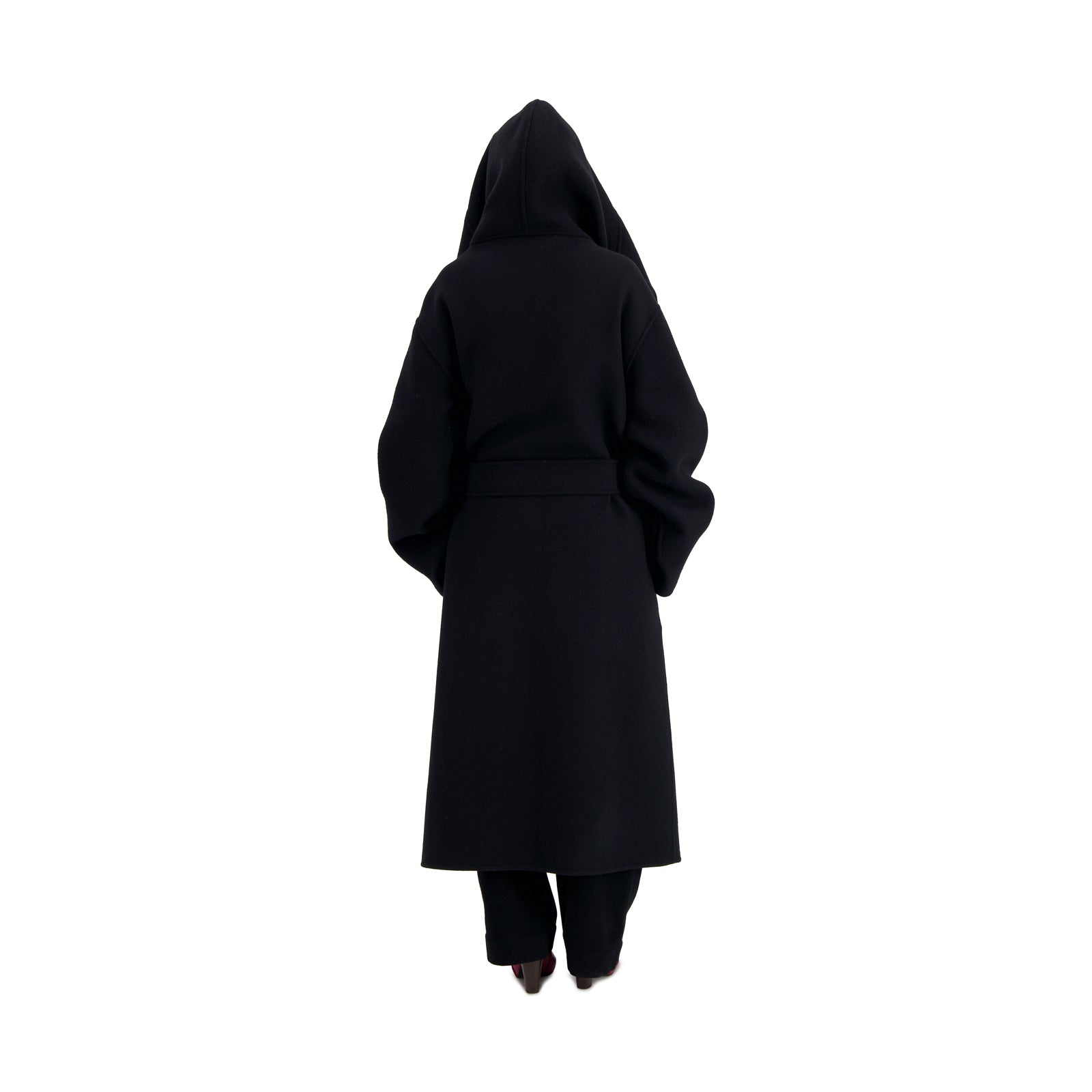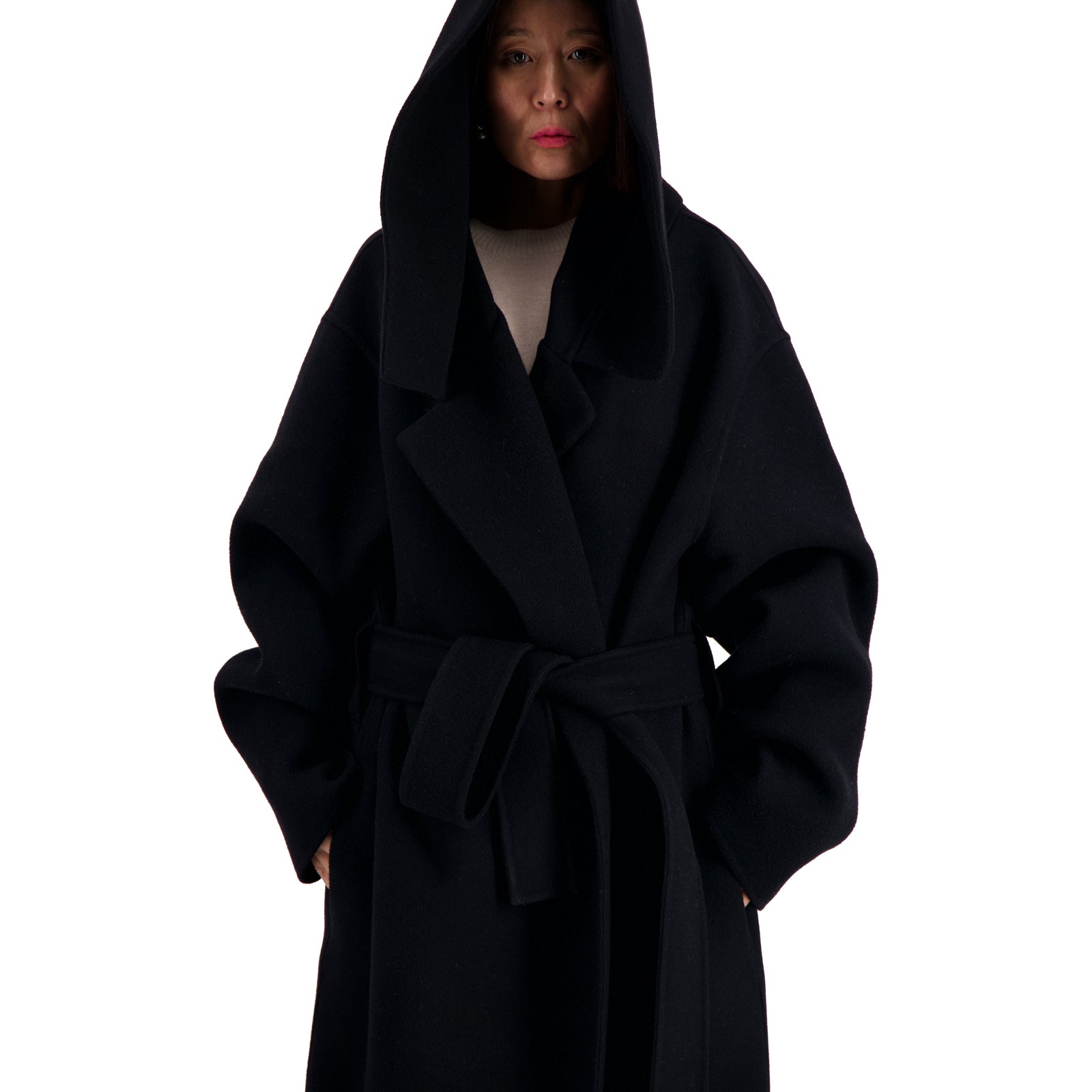 This wrap hooded coat is made of heavy Italian boiled wool soft to the hand.