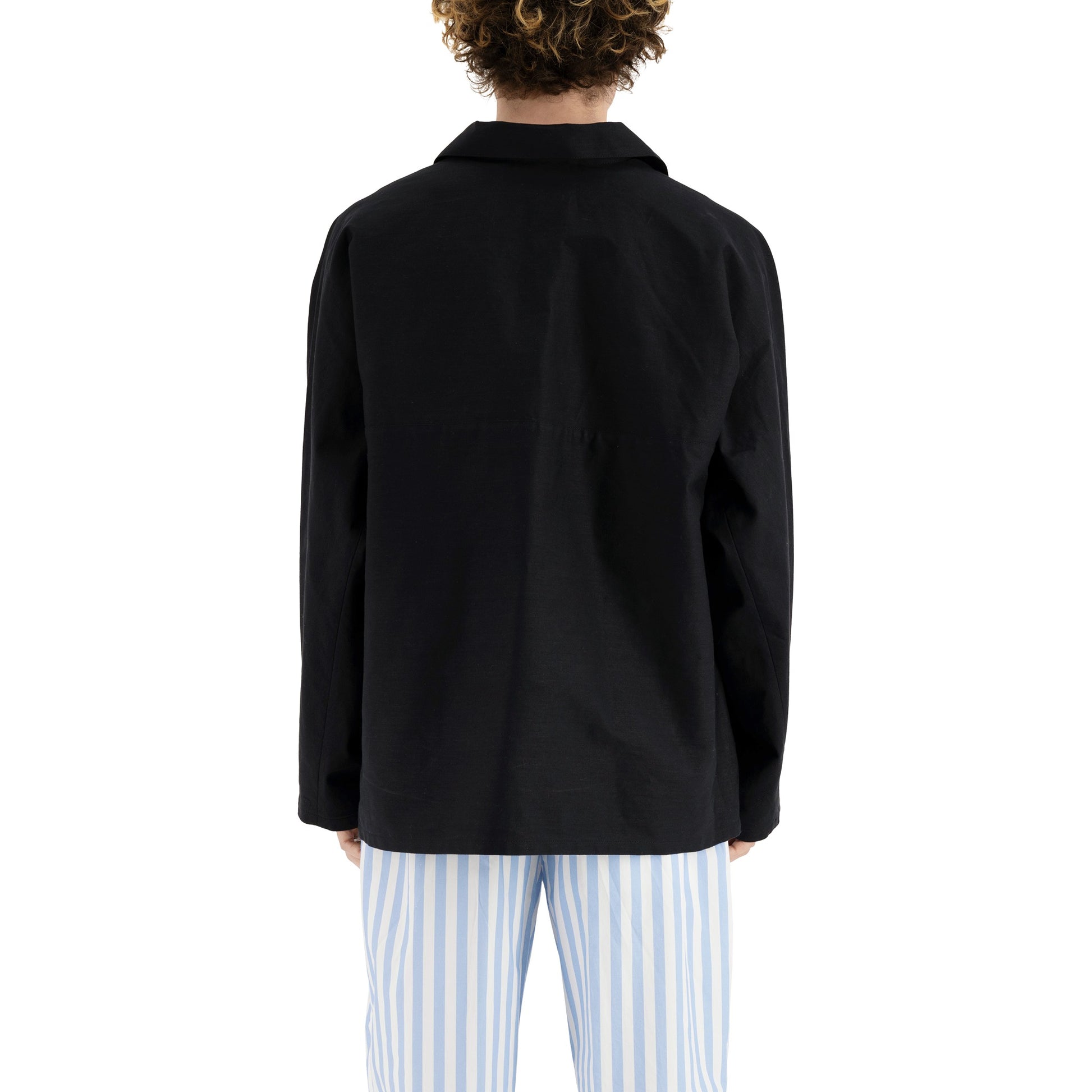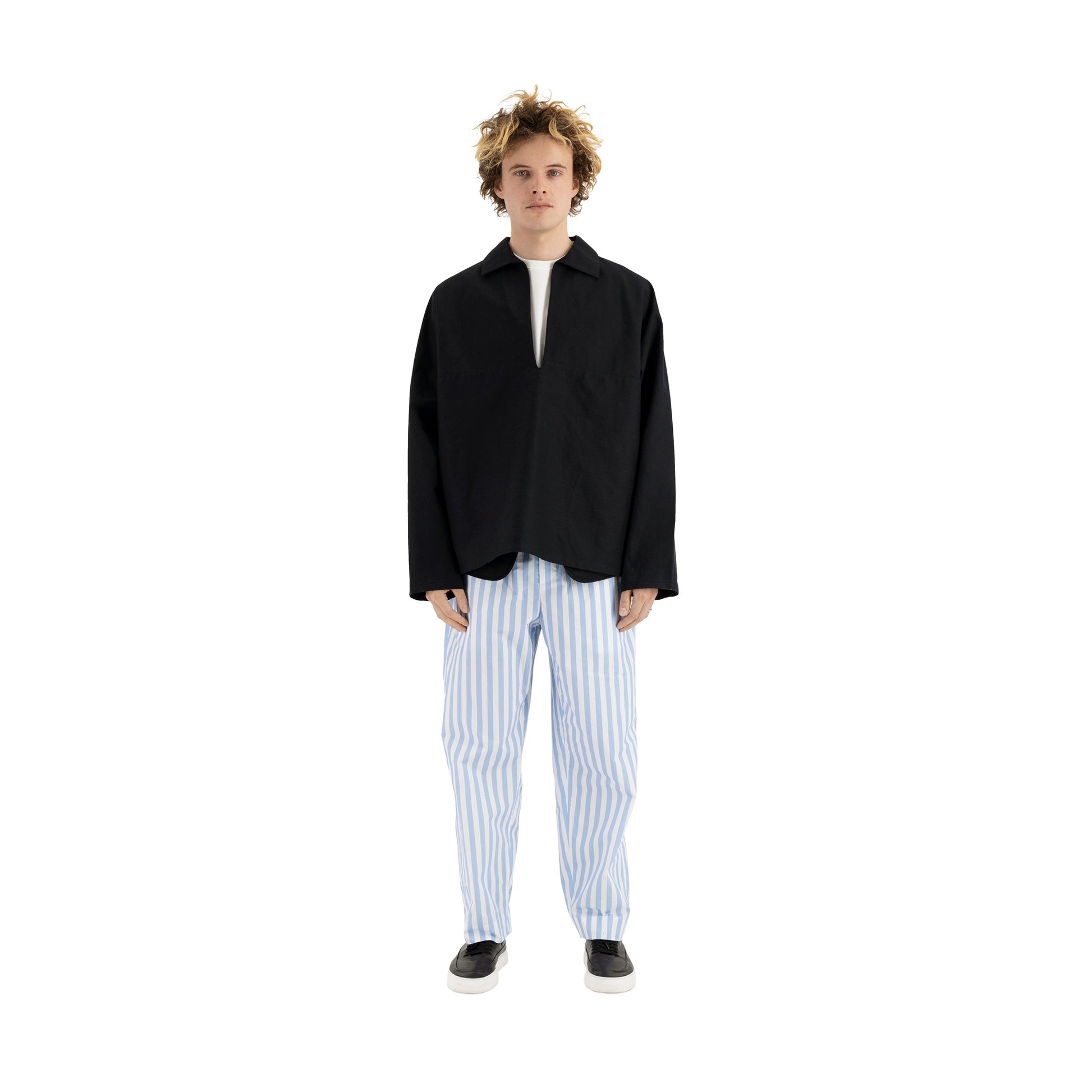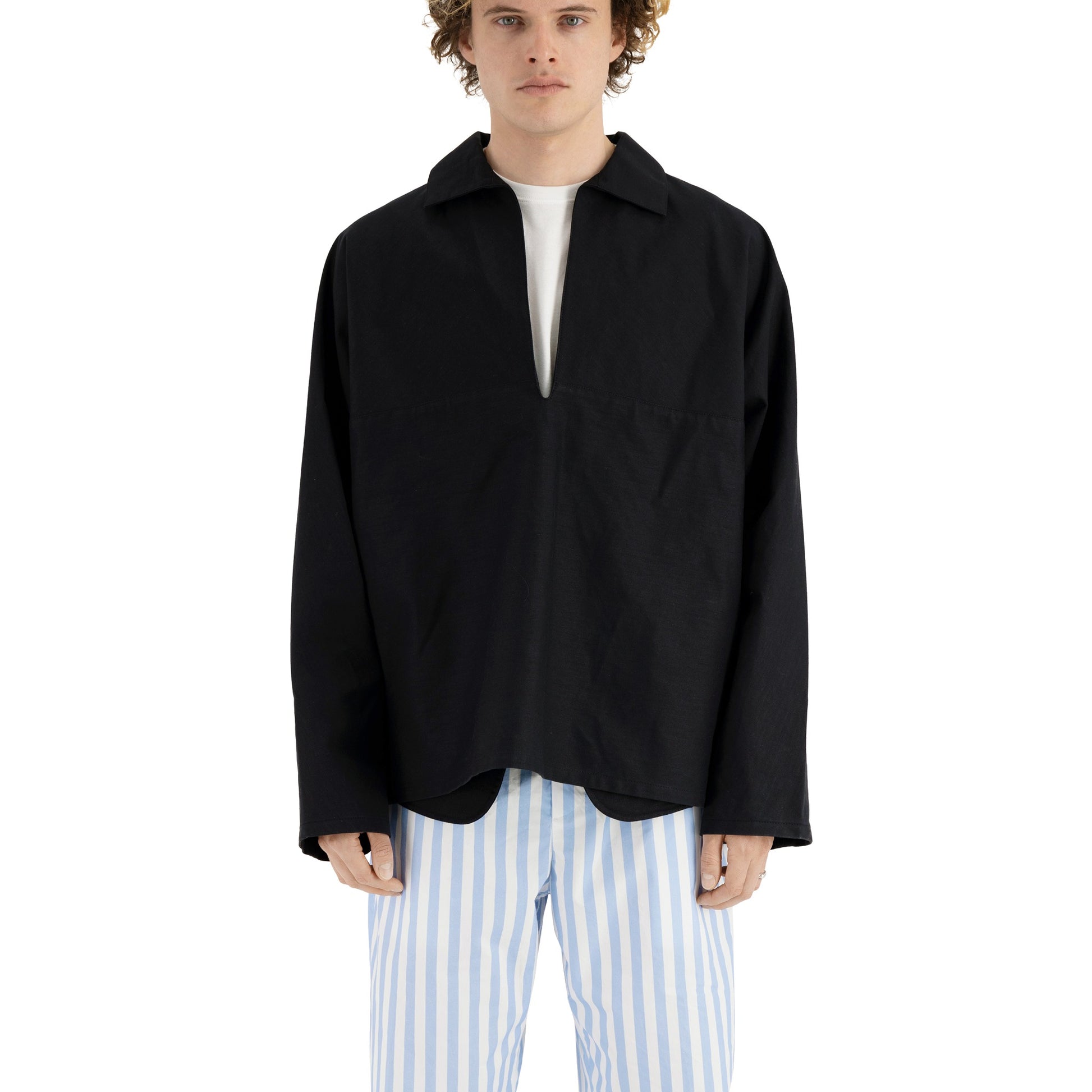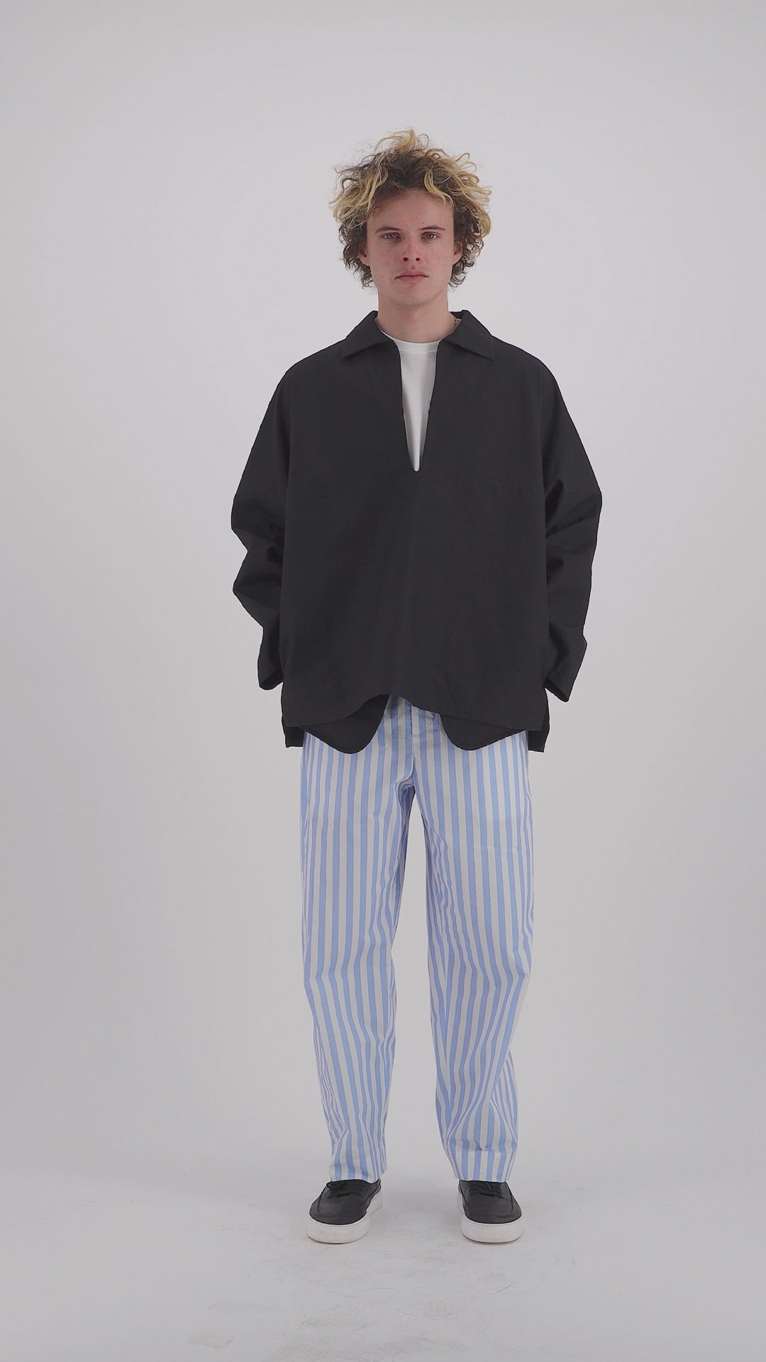 This unlined over- the - head anorak is made of japanese heavy cotton twill. It has an oversize fit with dropped shoulders and a shirting collar. It features a trompe l'oeil button line, without any buttons. Two hidden pockets on each side can be found at waist hight. The pocketbags show below the front waist as a design feature.