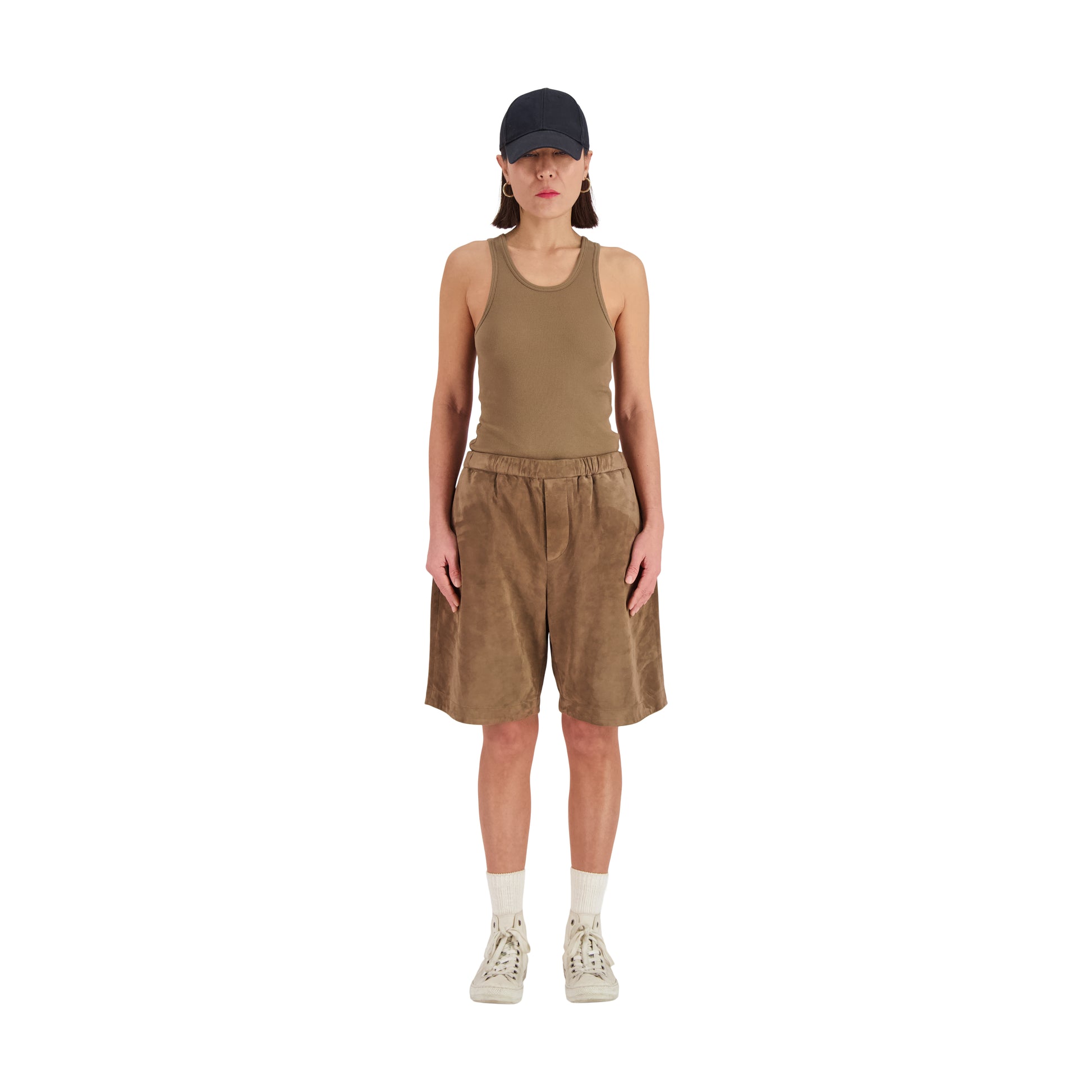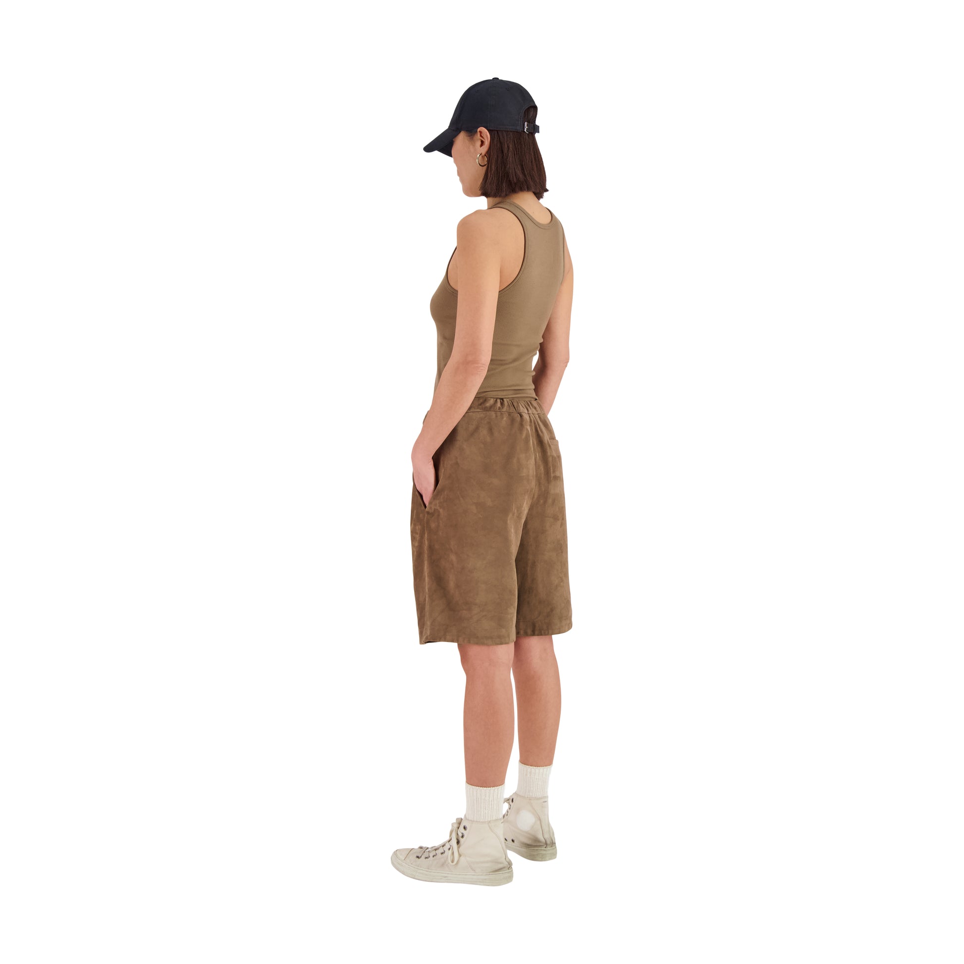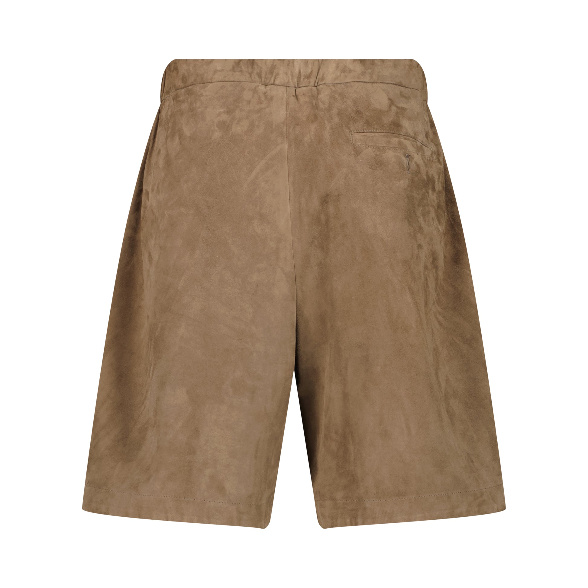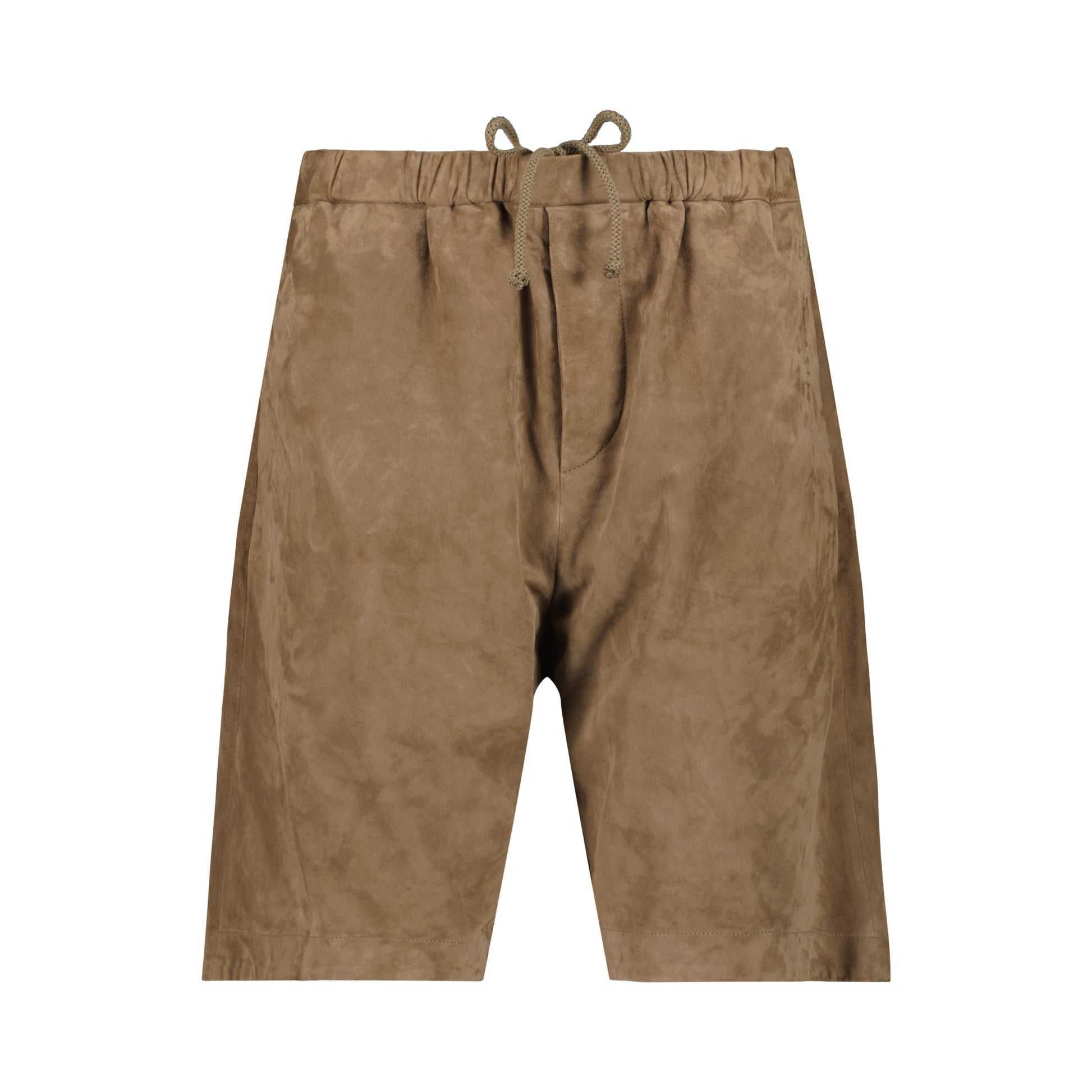 These drawstring shorts are made of italian lamb suede. They have a relaxed straight leg bermuda fit with a thin cotton drawstring inside the waist to allow adjustment for a comfortable fit. They feature two seam side pockets a three button fly and one back welt pocket with visible button.