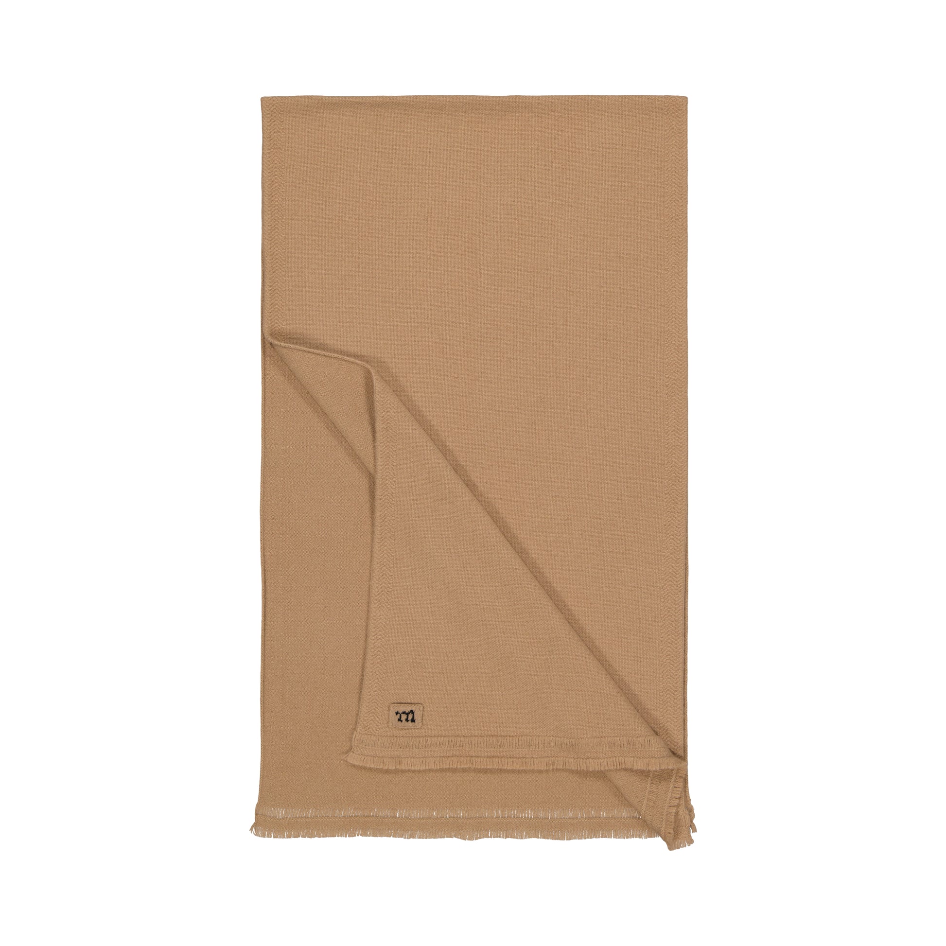 It features a fringing detail at both ends and a knitted cashmere intarsia contrast monogram patch.