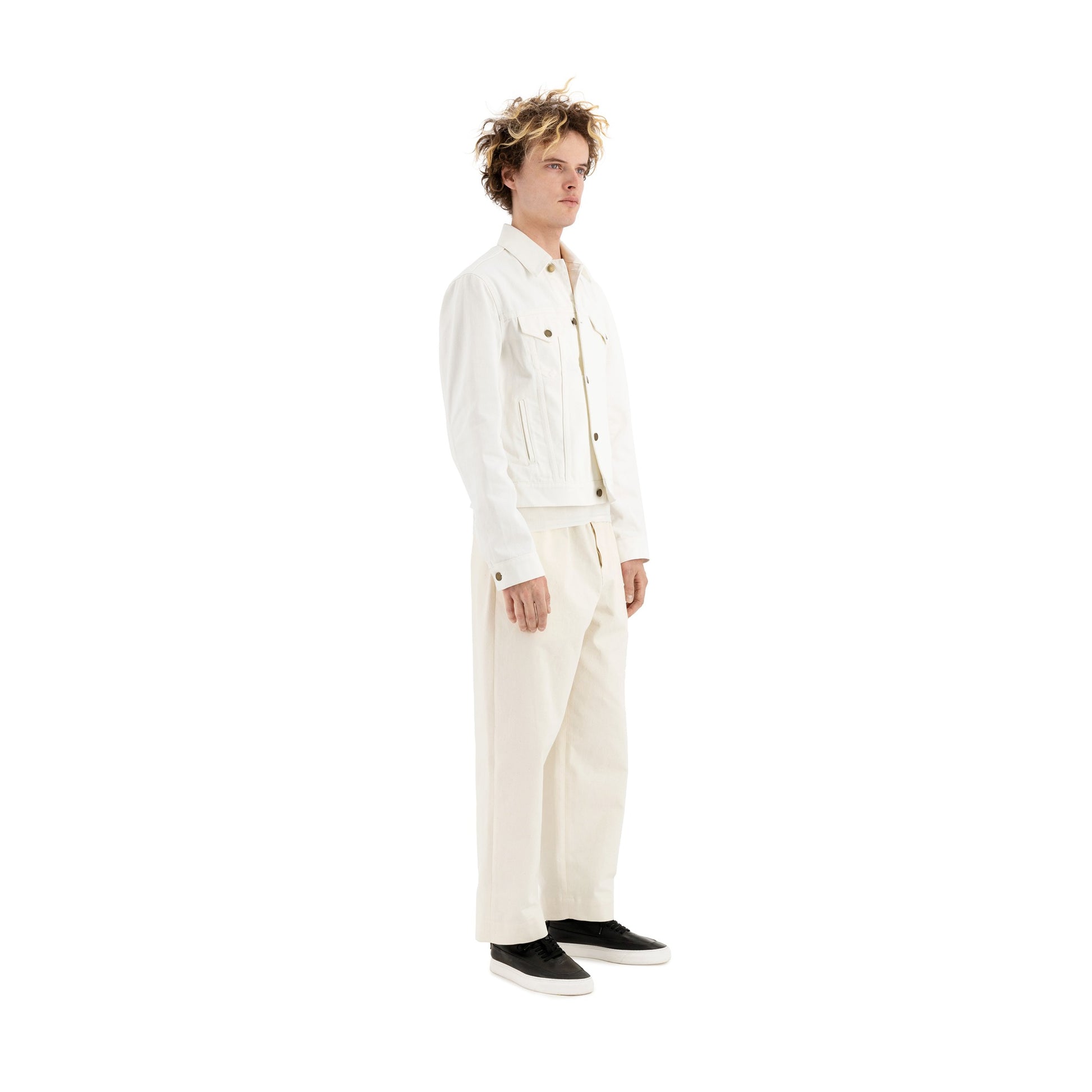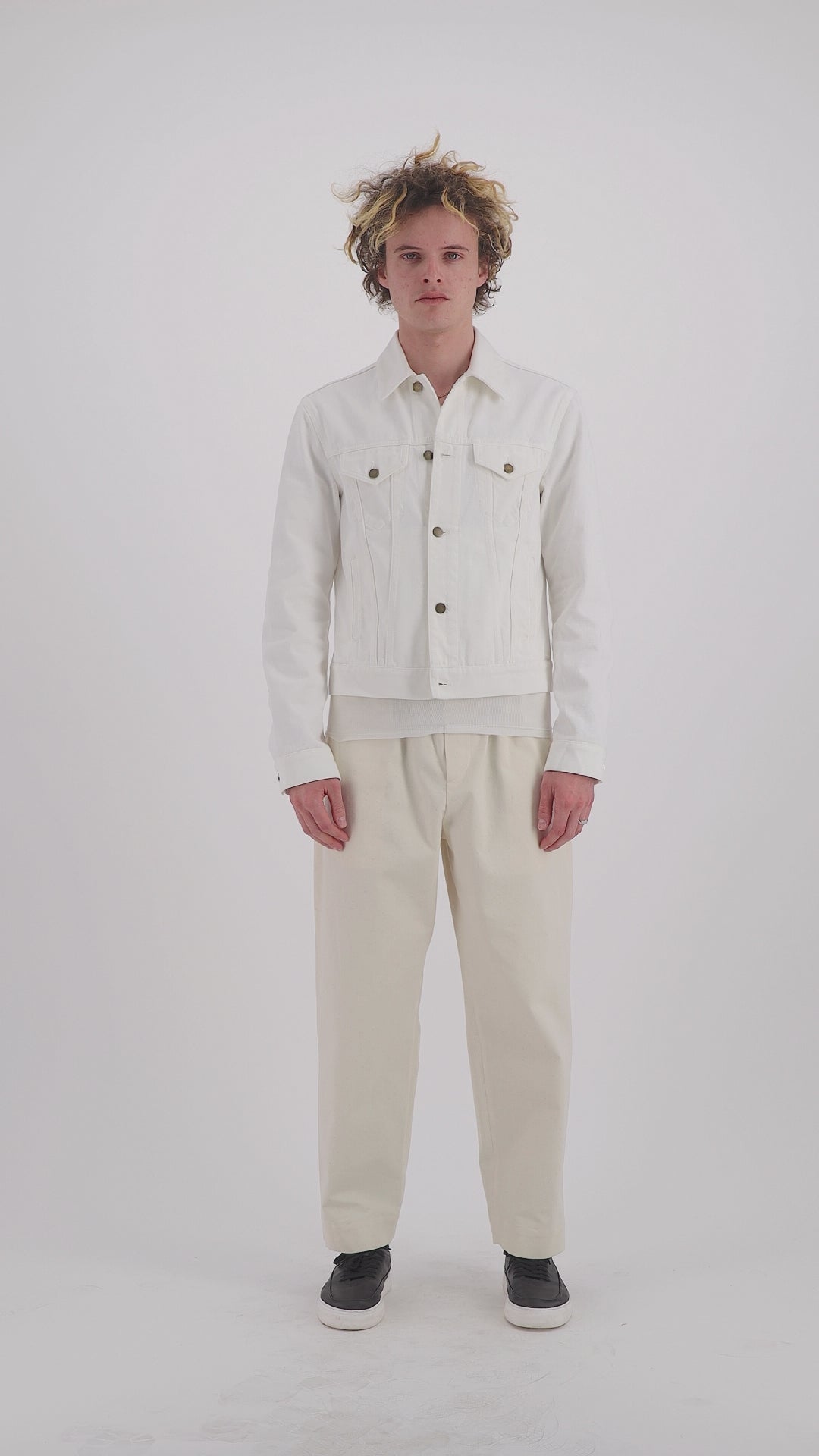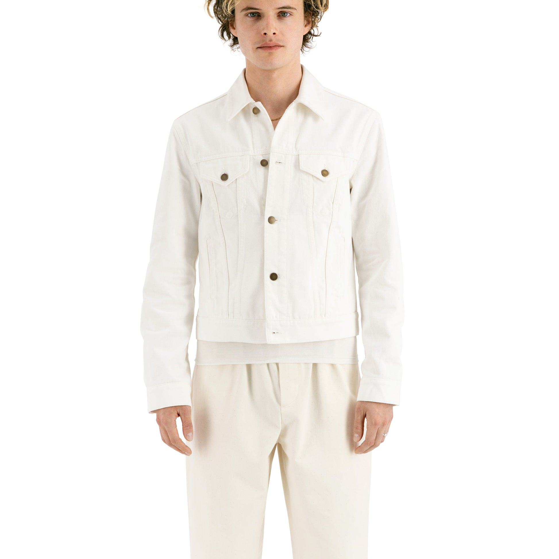 It features two chest pockets and visible denim buttons on the pockets, the button line and the side adjusters.