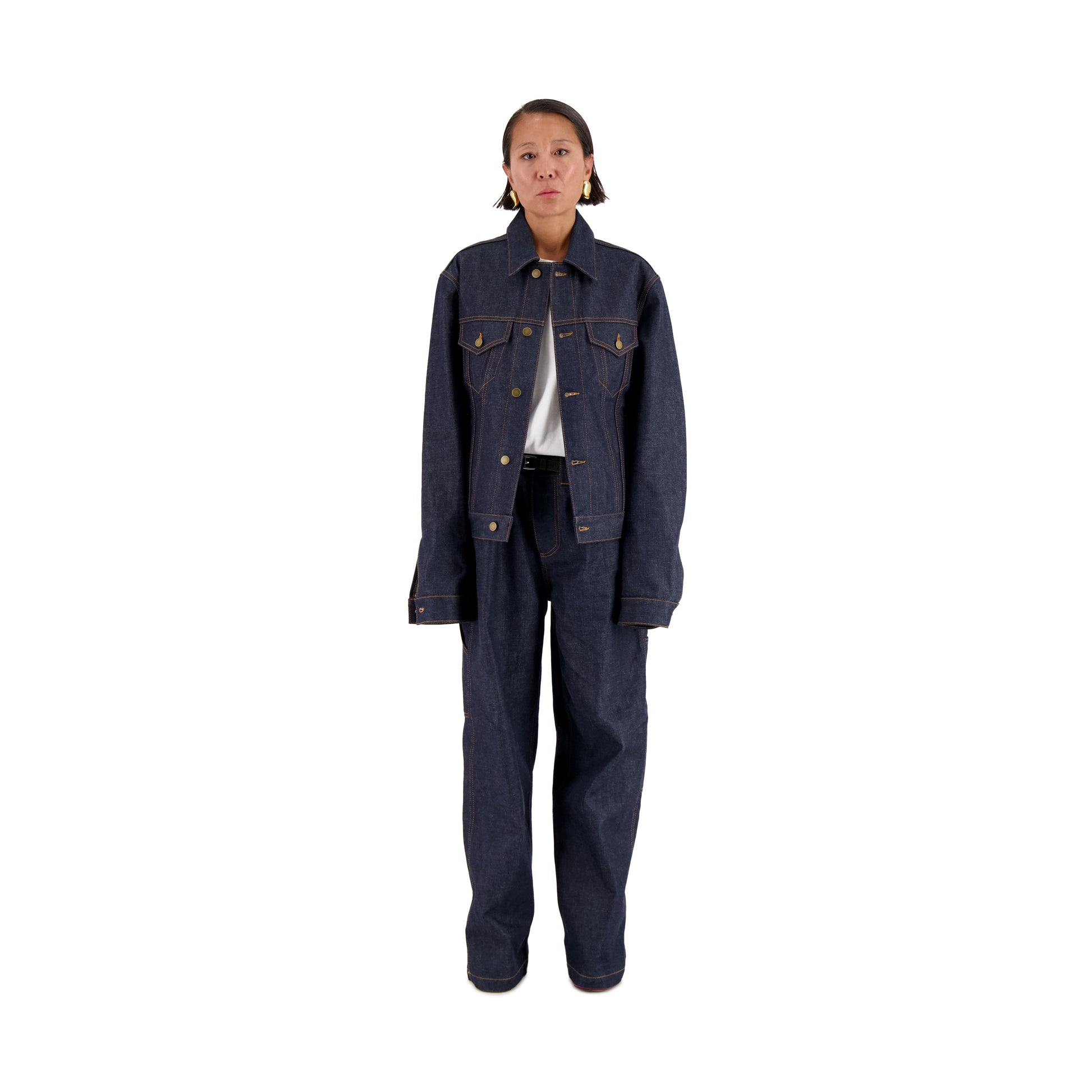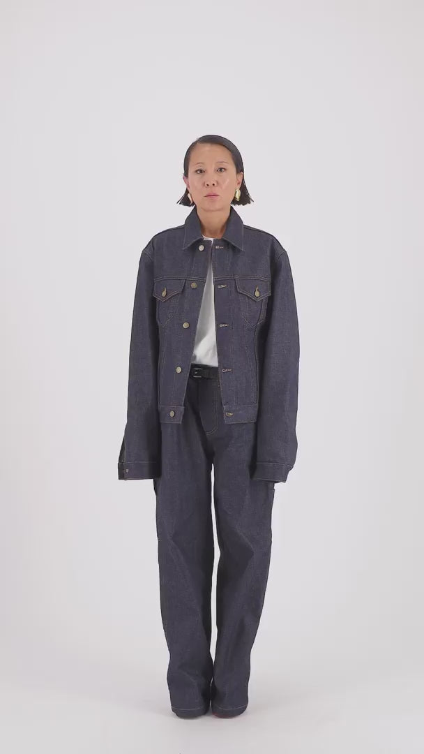 This unlined denim trucker jacket is made of Japanese raw denim.