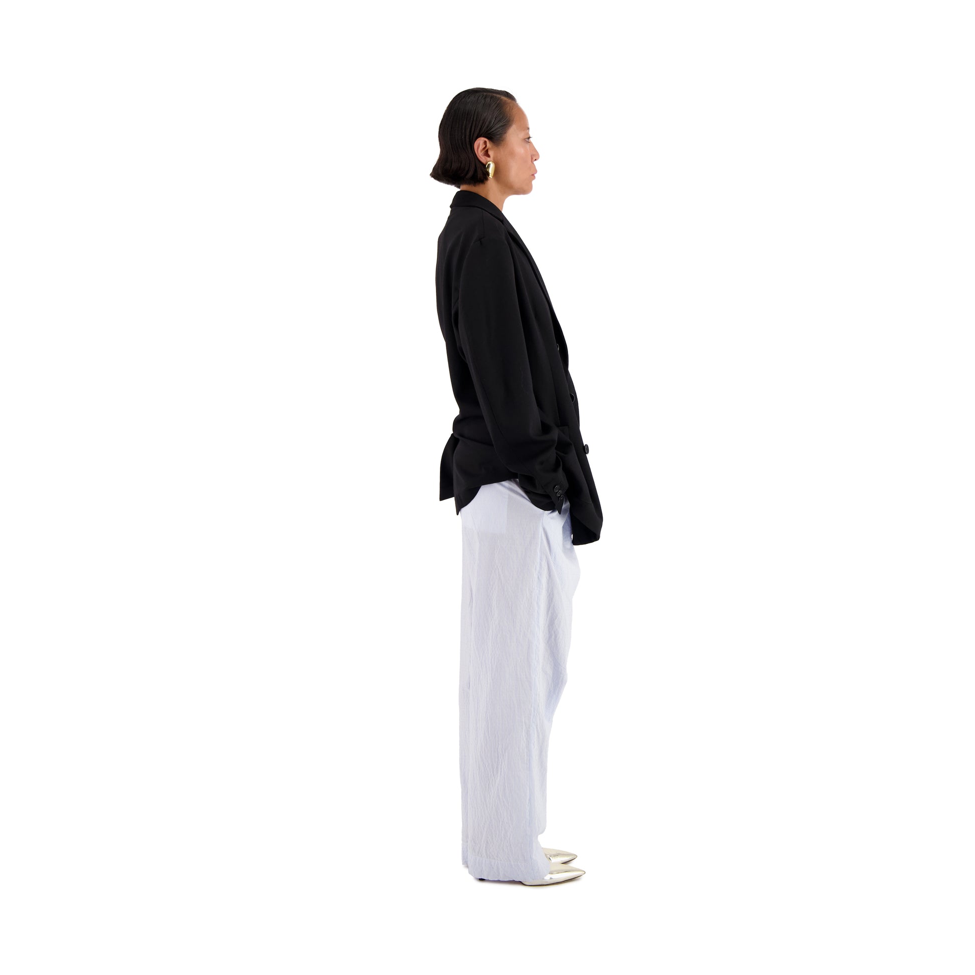 The jacket has complete uncontructed shoulders and features a notch lapel.