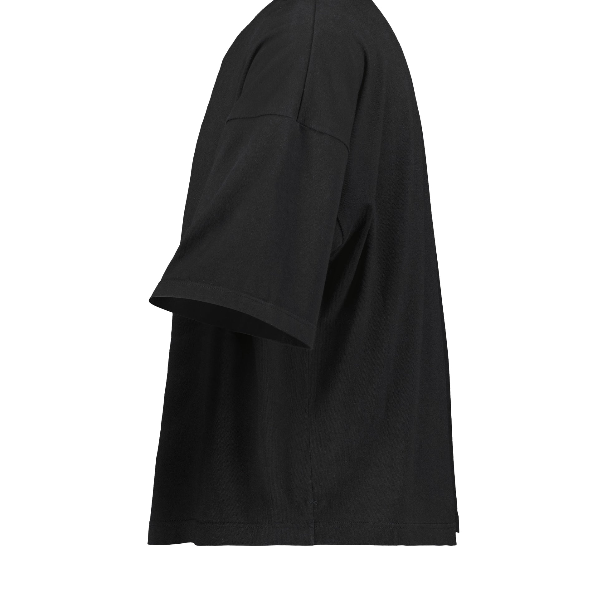 It has a dropped shoulder and falls loose. The body is slightly cropped.