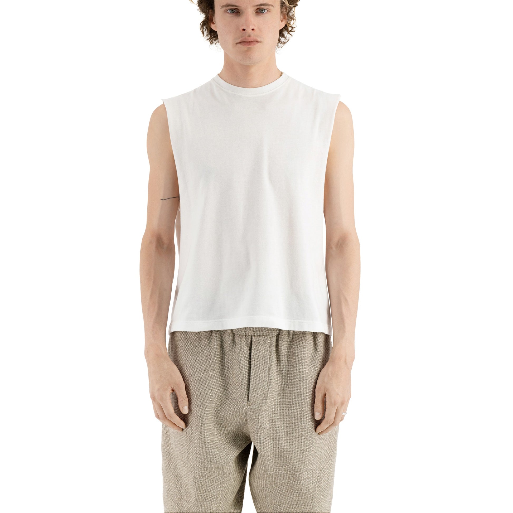 This tank t-shirt is made of a mid-weight italian jersey. It has an exaggerated armhole and falls loose. The body is slightly cropped. The crew neck is fitted and ribbed. The meta campania collective label is printed inside the neck and purposefully visible through the t- shirt. A tonal monogram is stitched on the left side seam.