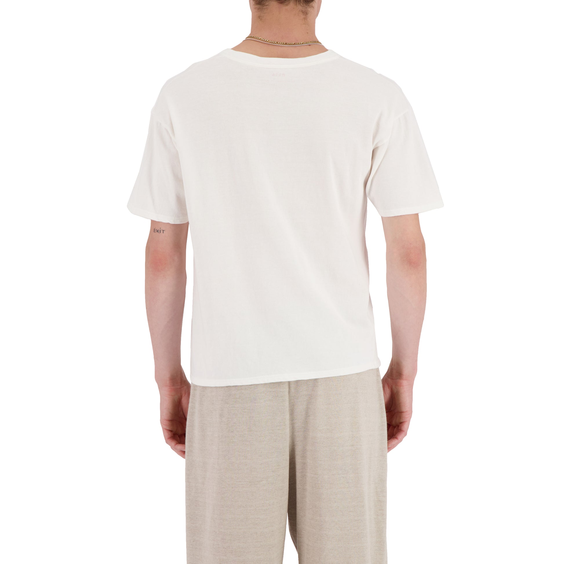 The Meta Campania Collective label is printed inside the neck and purposefully visible through the t-shirt.